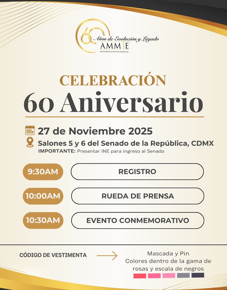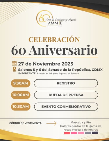 📌 Nos emociona invitarlas a celebrar el 60 Aniversario de nuestra Asociación en un evento protocolario en el emblemático Senado de la República, en la Ciudad de México, el jueves 27 de noviembre.